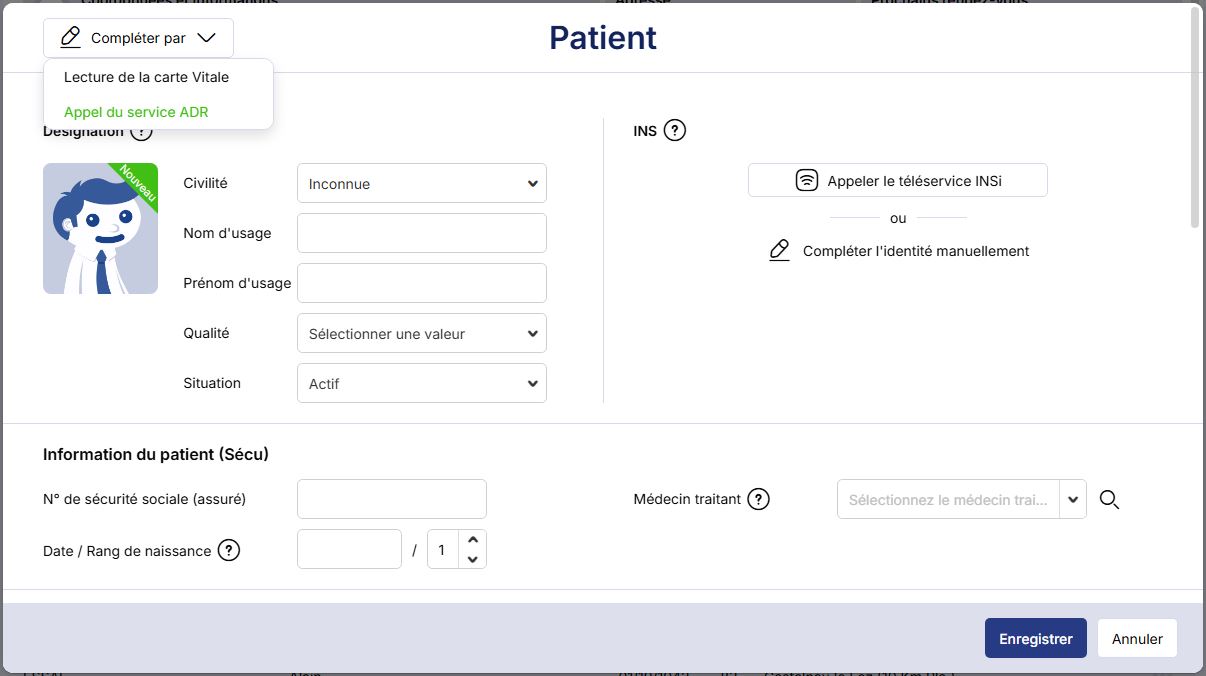 Il faut saisir la Date de naissance, le rang de naissance (indiquez toujours 1) et le numéro de sécurité sociale de votre patient/e. Cliquez ensuite sur le bouton Compléter par… puis sur Appel du service ADR