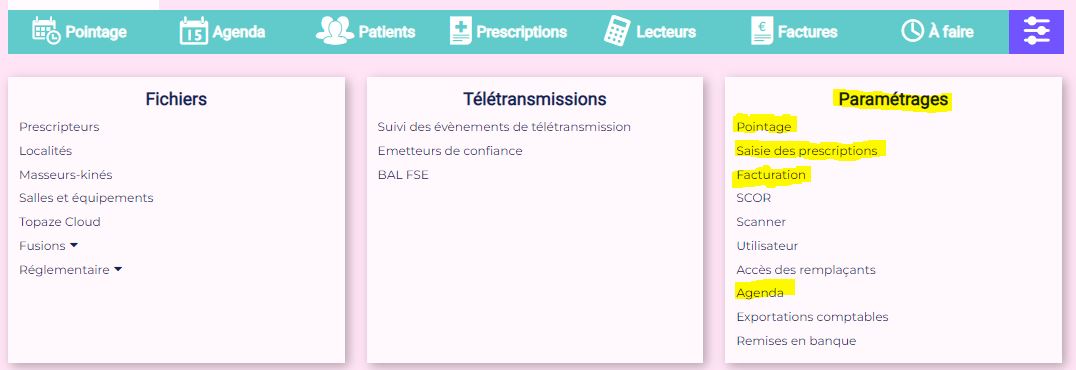 Orthomax by Topaze vous propose de personnaliser certaines fonctionnalités comme le pointage, la saisie des prescriptions…etc. Pour y accéder il faut aller dans les réglages puis dans le pavé Paramétrages.