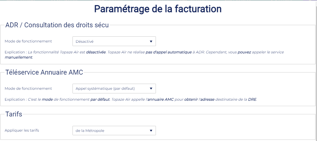 Téléservice Annuaire AMC : permet de choisir si vous préférez que Topaze Air appelle l’Annuaire AMC ou non par défaut.