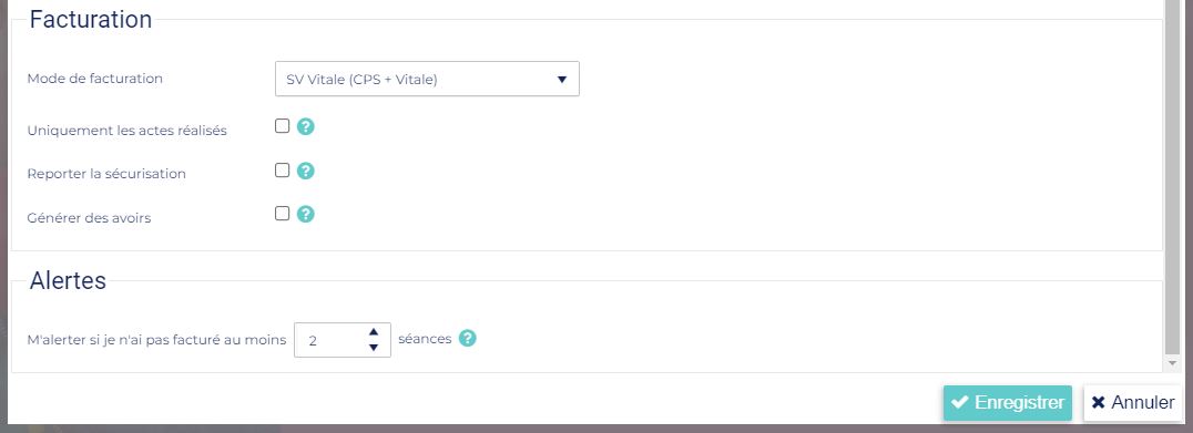 Alertes : Vous permet de définir un seuil de séances restantes à facturer qui si il est dépassé, fera apparaitre une alerte dans la colonne INFOS du pointage.