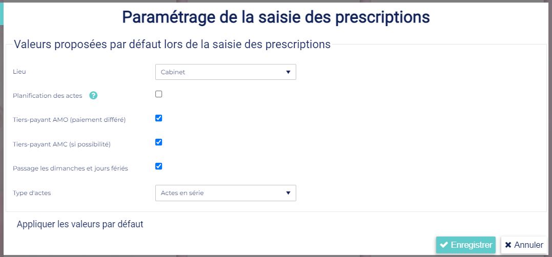 Lieu : permet de choisir le lieu du traitement des prescriptions par défaut sur cabinet ou domicile.
