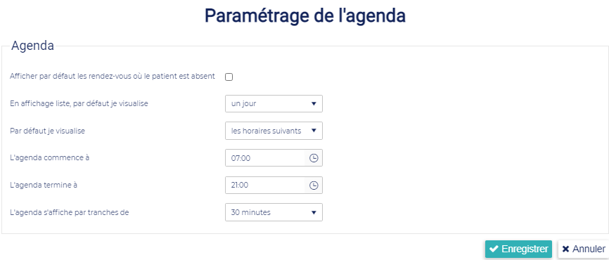 Afficher par défaut les patients absents : si un patient est déclaré absent, alors les rendez-vous sont écartés de la facturation et de l’agenda. Mais il est possible avec cette option de voir tout de même ce rendez-vous prévu à l’origine dans l’agenda.