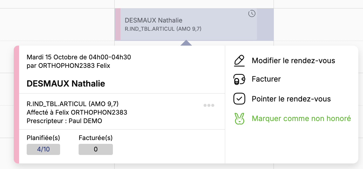 Depuis l’agenda, lorsque vous passez la souris sur un rendez-vous, dans la bulle qui apparait, cliquez sur Marquer comme non honoré.
