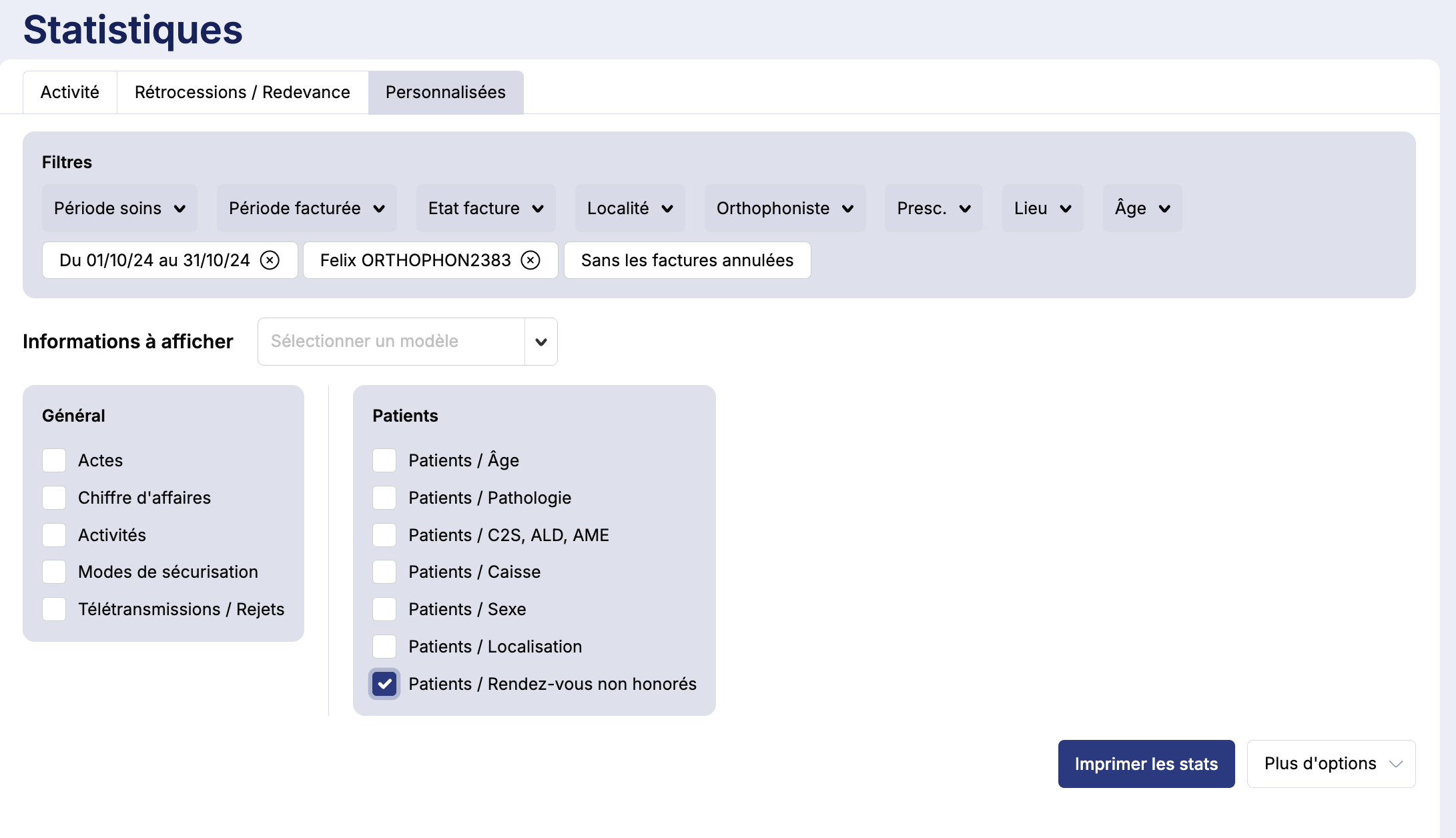 Cette option vous permet de faire un suivi des rendez-vous par patient et d’en connaitre le taux d’assiduité. En effet, les rendez-vous non honorés ont été ajoutés aux statistiques personnalisées :