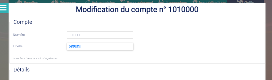 Le numéro de compte est modifiable uniquement s’il n’y a pas d’écritures liées à celui-ci.