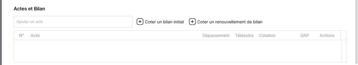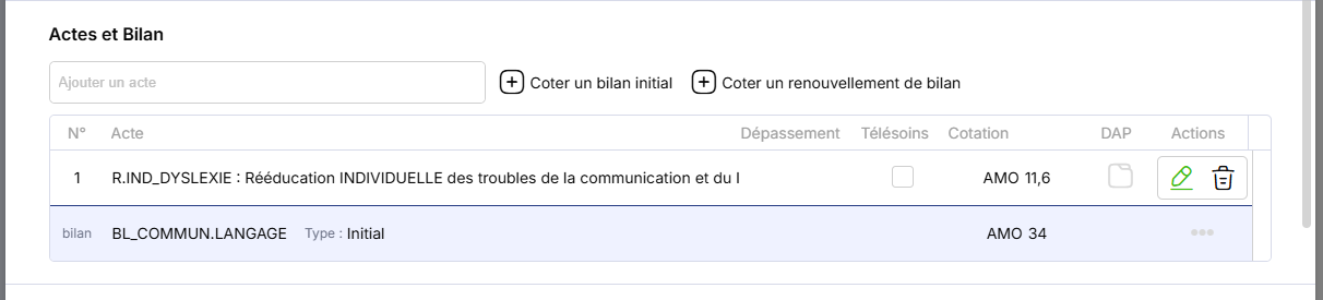 Une fois l’acte et/ou le Bilan choisis, à droite vous trouverez les colonnes DAP (pour l’acte) et Actions pour modifier certaines informations comme Initial, intermédiaire pour le bilan ou sa date de réalisation ou rajouter un dépassement pour l’acte et son montant ou voir le détail de l’acte en cliquant sur la loupe. Vous trouverez aussi le symbole de la corbeille pour supprimer la ligne en cas d’erreur.