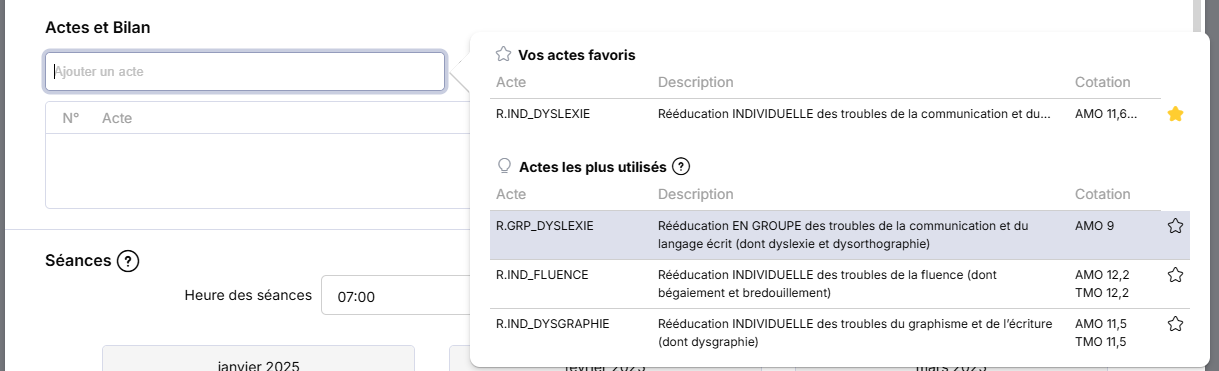 Dans l’encadré « Actes et BDK », en cliquant dans la case « ajouter un acte », le logiciel vous propose une suggestion d’actes les plus utilisés et même vos actes préférés marqués comme favoris pour les retrouver facilement. Il vous suffit de cocher la petite étoile à droite des actes que vous souhaitez épingler.